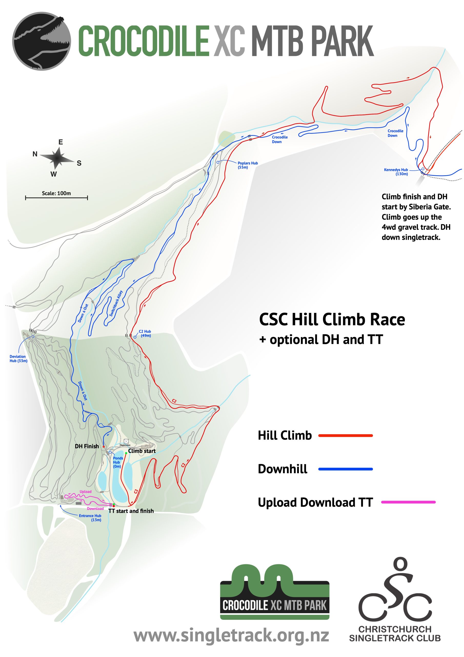 Hillclimb: Starting at the ponds competitors will sprint along the middle stopbank, then head up C2. After exiting the trees riders will continue along Tiga’s then Crocodile Up. When you reach Kennedy’s Bush Track you will ascend on the 4WD track until you reach the finish line at the gate where Siberia begins.
